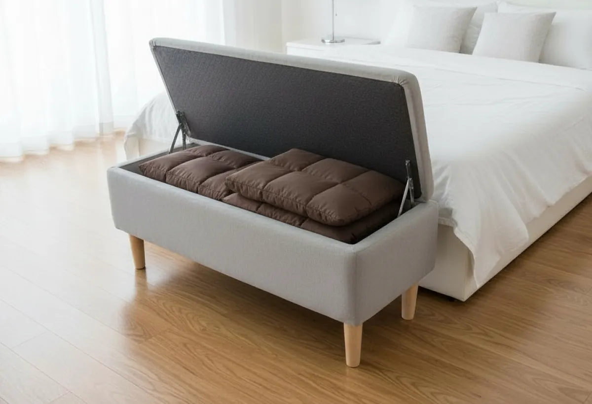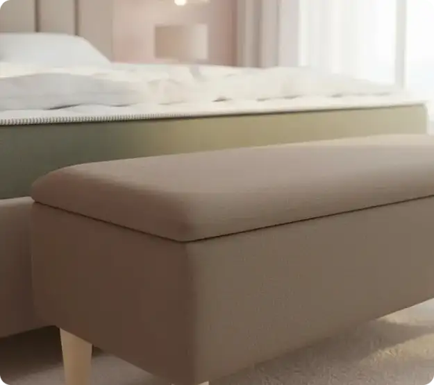 - В спальне банкетка Sarma станет уютным местом для утреннего кофе или вечернего чтения, а также практичным хранилищем для постельных принадлежностей.